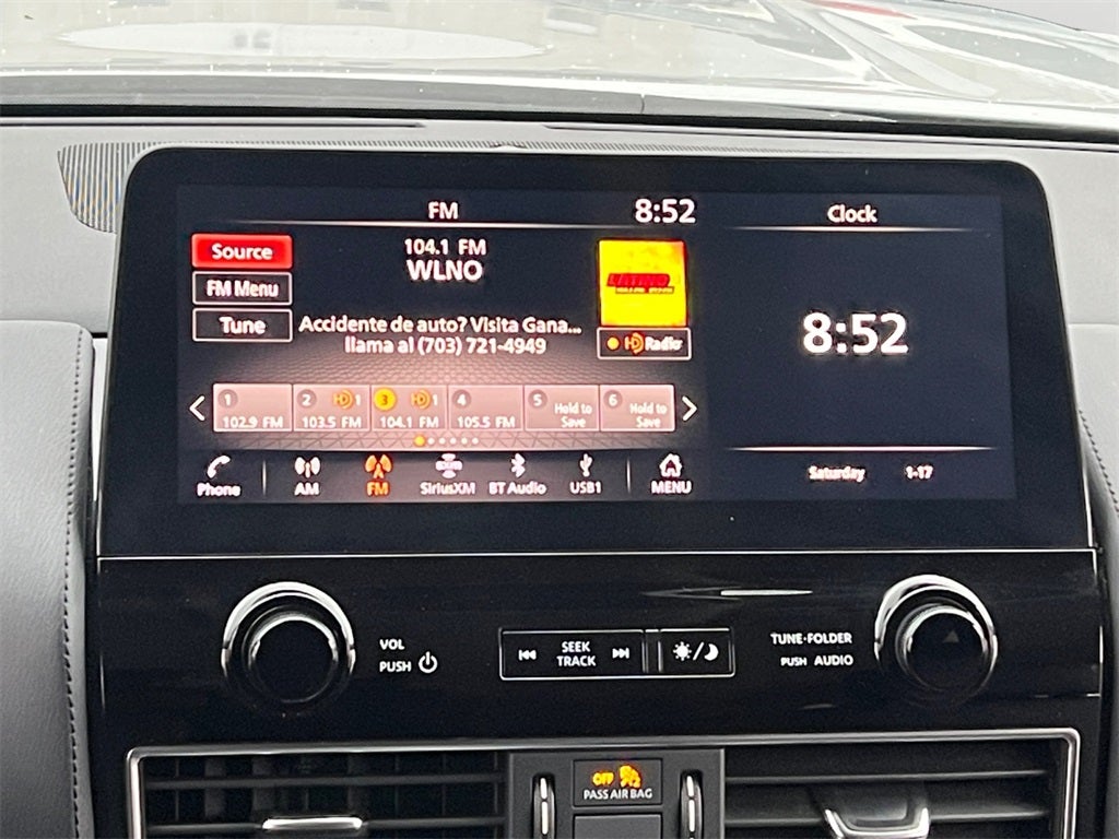 - Radio: NissanConnect w/SiriusXM -inc: 6 speaker audio system, Alexa built-in, wireless Apple CarPlay, Android Auto, Nissan door to door navigation, 12.3" color display w/multi-touch control, SiriusXM Traffic and Travel Link w/3 month complimentary trial access, NissanConnect Services powered by SiriusXM, Bluetooth® hands-free phone system, hands-free text messaging assistant, enhanced voice recognition, USB port for compatible devices, HD Radio technology and Wi-Fi hotspot